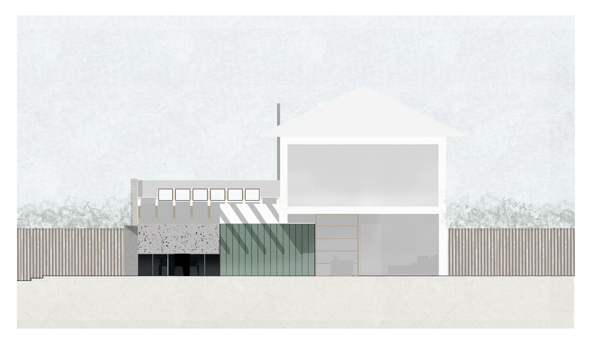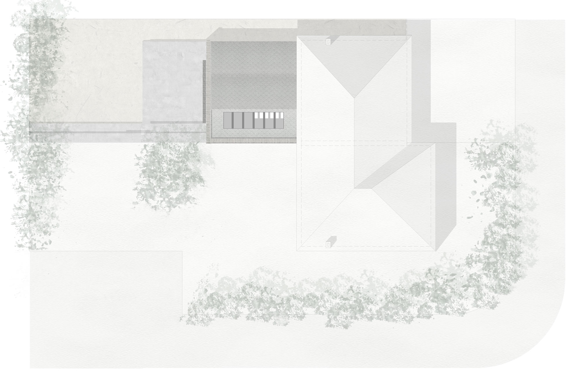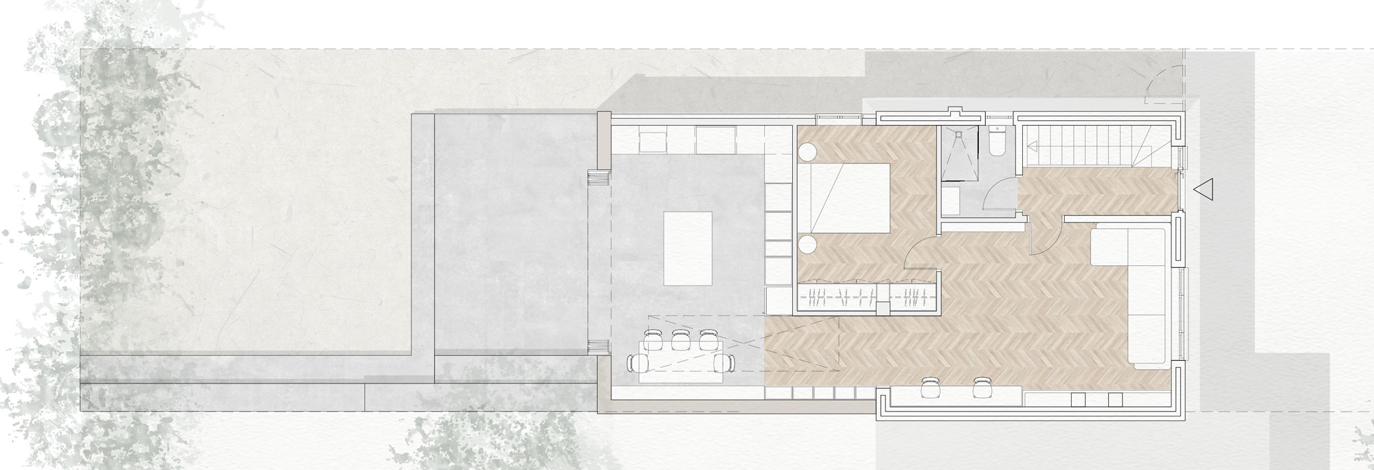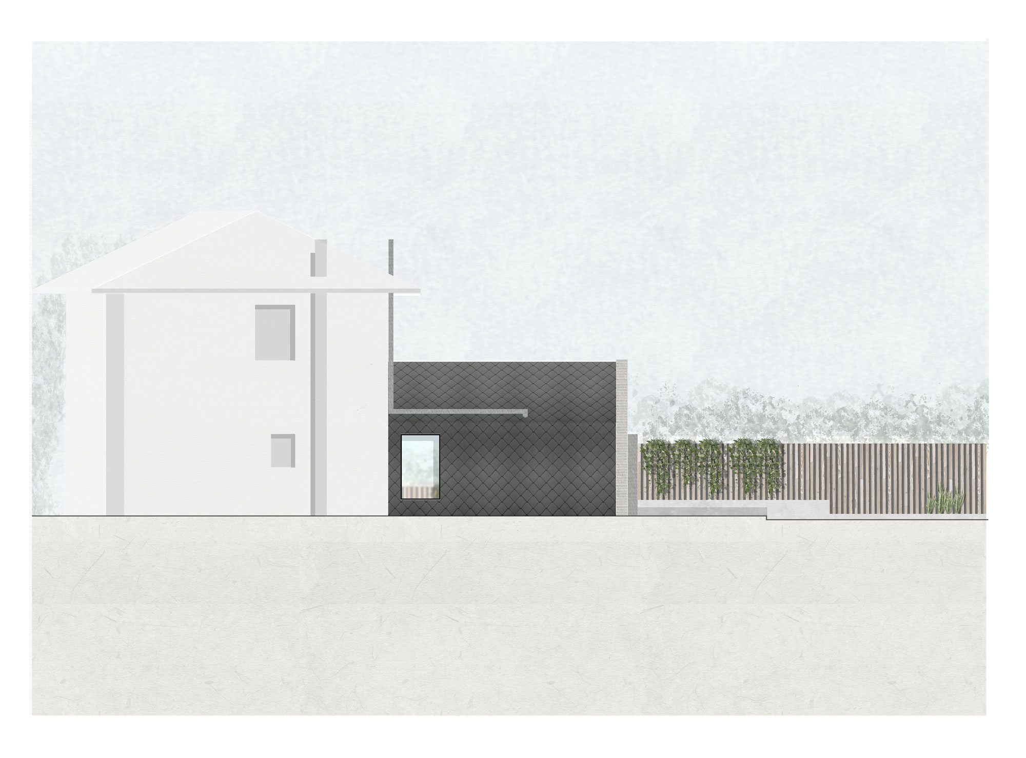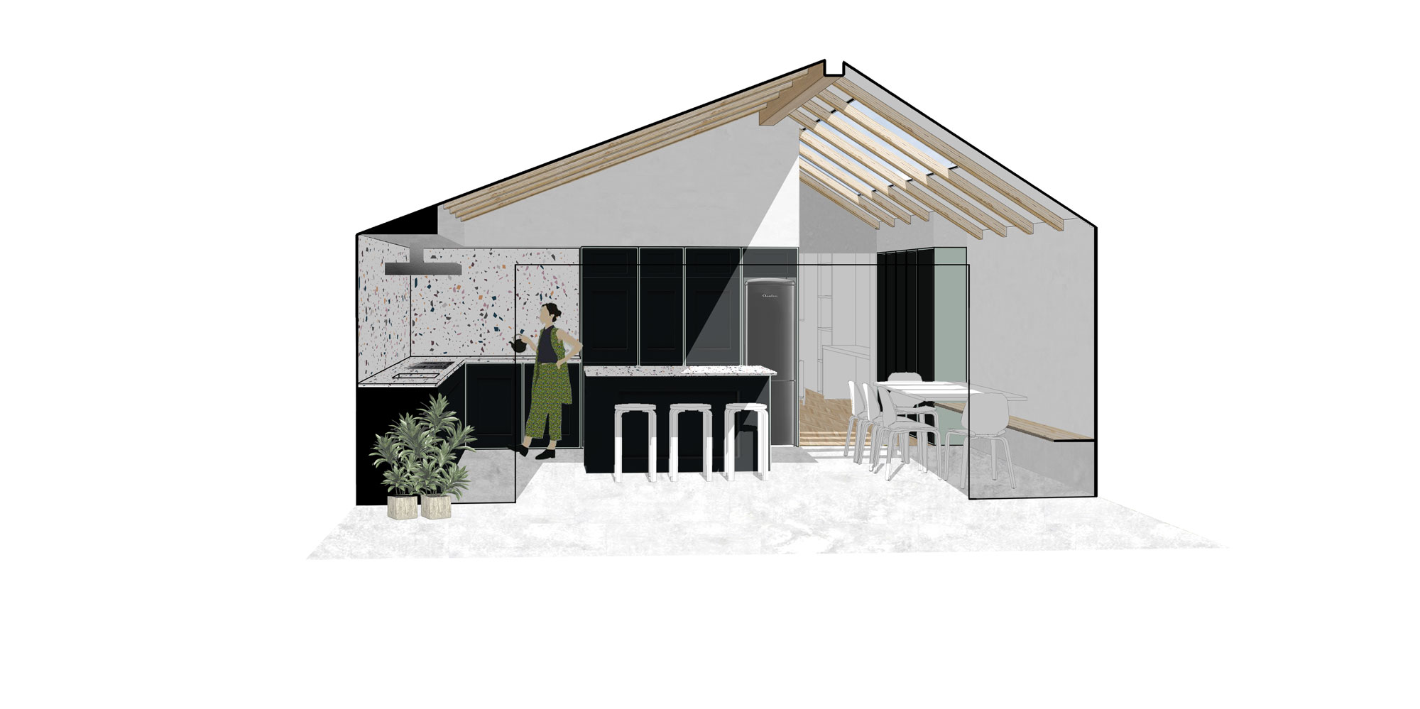 La propuesta es un volumen a dos aguas adosado a la fachada posterior de la casa, simpatizando con el lenguaje de la arquitectura local, minimizando el impacto en el barrio y maximizando el volumen interior del espacio salón-comedor-cocina.